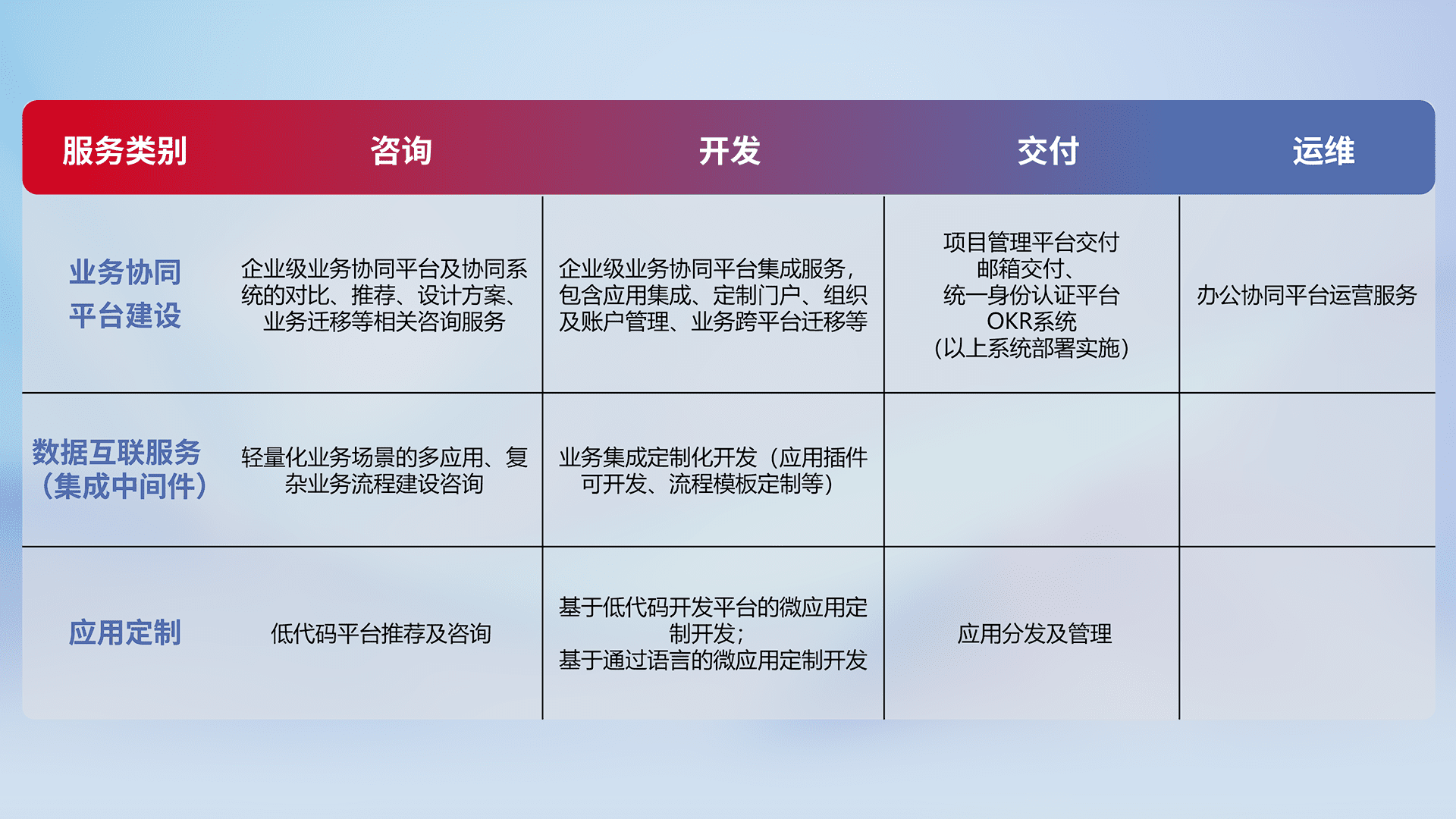 针对钉钉、、企微、、IDaas等平台级产品提供产品的规划、、、方案、、、、交付、、、定制化开发等服务,,,实现如统一协同办公、、智能客户服务、、混合会议管理、、智能数据查询、、、等业务场景,,,,实现数字化转型。。