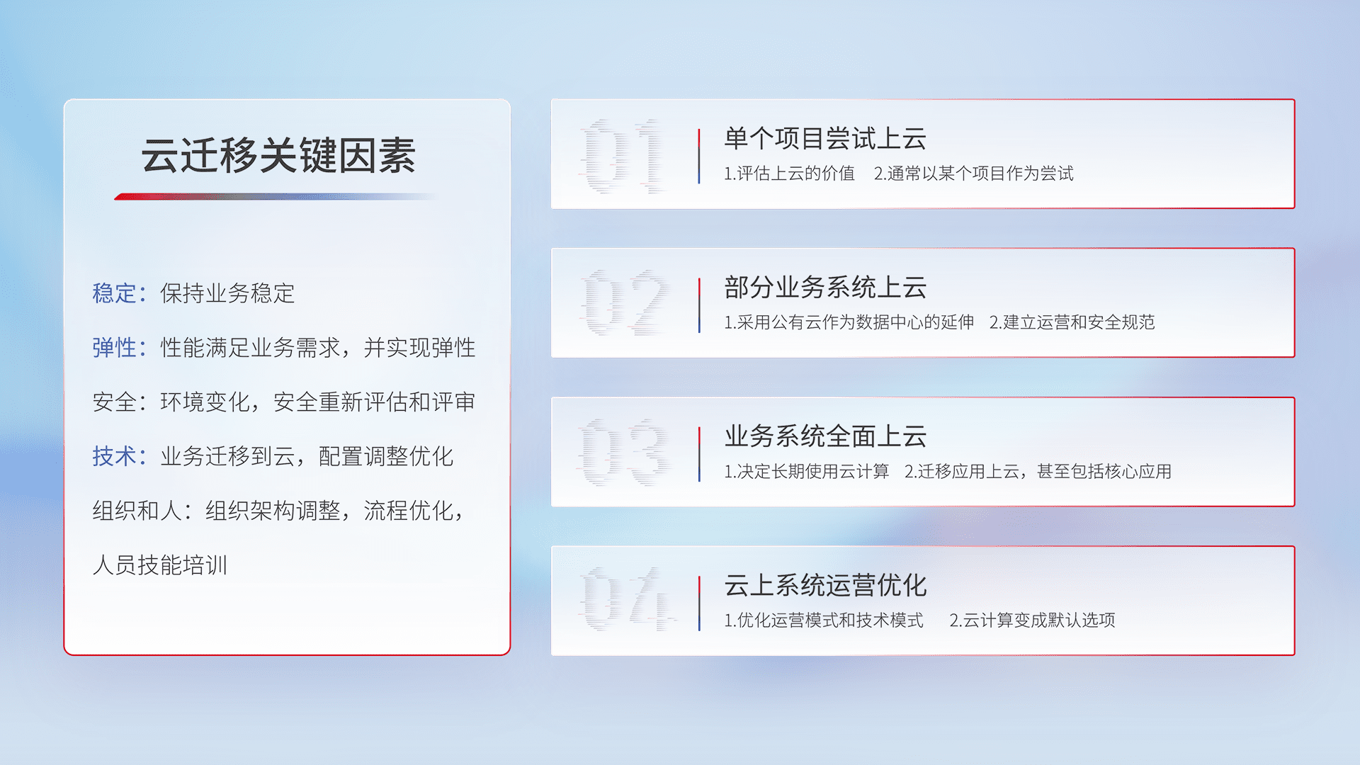 结合实际业务,,从规划设计、、、云平台选型、、云原生改造、、数据迁移、、、集成交付,,,,迁移全过程为客户识别最佳上云路径,,做好风险识别管理,,,,设计网络架构、、、身份权限、、安全审计合规、、、、操作审计、、、、日志审计、、、、监控告警策略、、多站点容灾设计等,,,对云上基础设施进行整体规划,,提升IT治理水平,,,以满足弹性、、高可用、、高性能的需求。。。