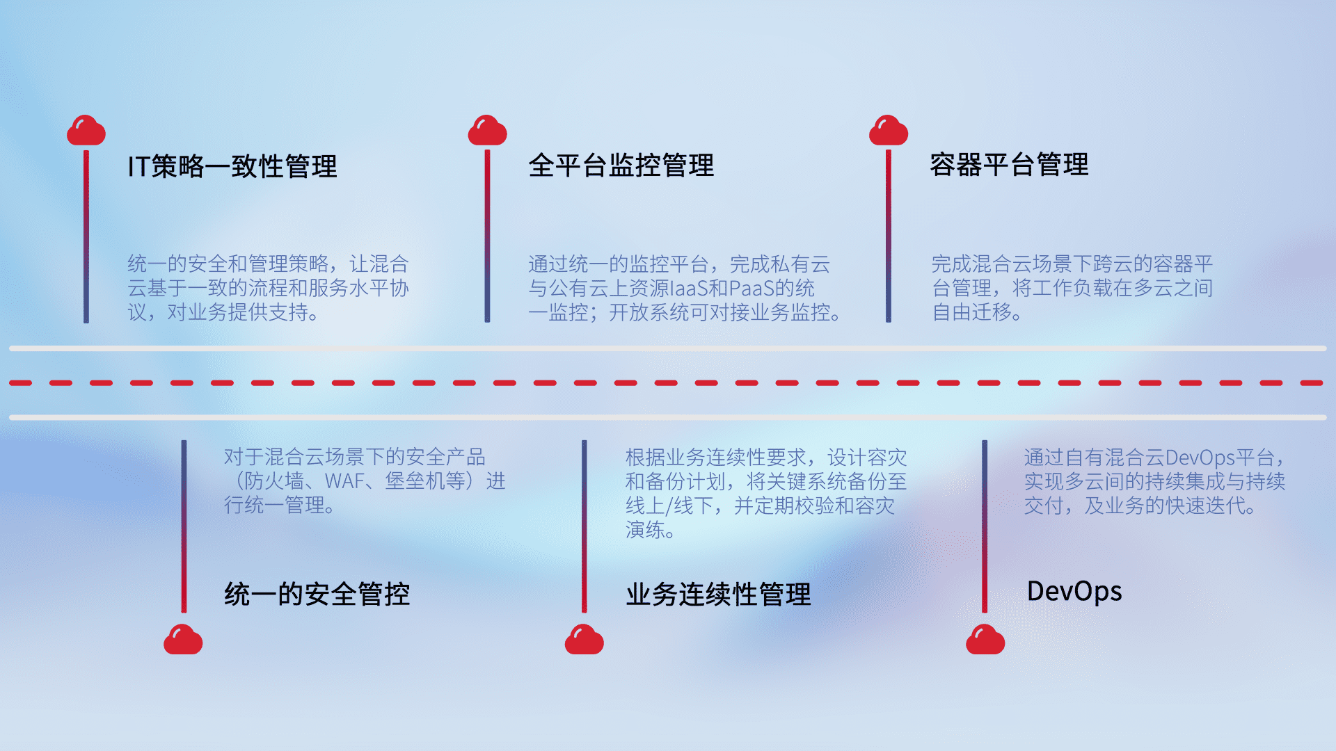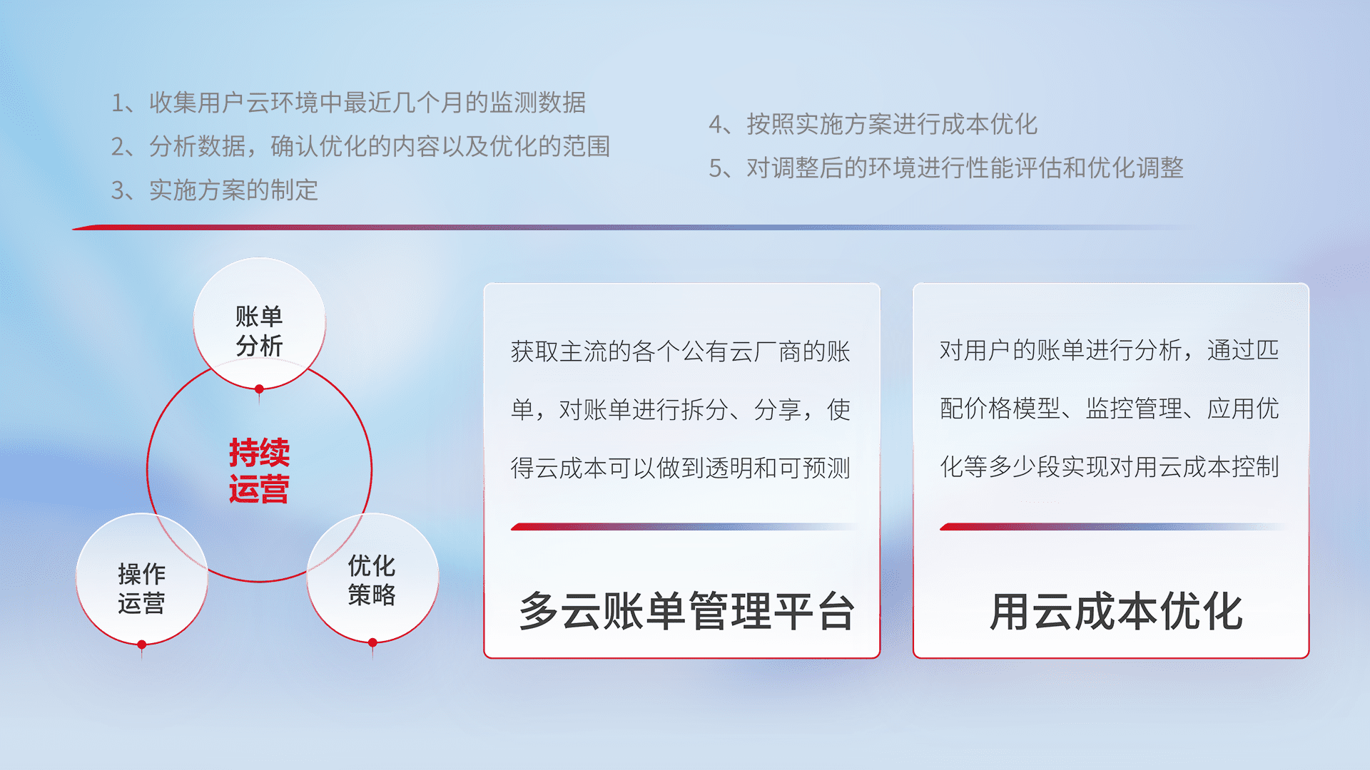 通过多云纳管,,,,以统一的资源数据模型把客户的云资源进行抽象和封装,,,进而实现对多云资源的统一操作,,,保障云资源管理的可靠性、、、、稳定性与可用性。。量身定制化运维内容,,,配置、、、、开发运维、、、补丁管理、、备份、、、、监控、、认证和访问管理、、、审计和日常巡检等,,,保障在用云过程中的可靠度,,稳定度以及高可用率。。。。